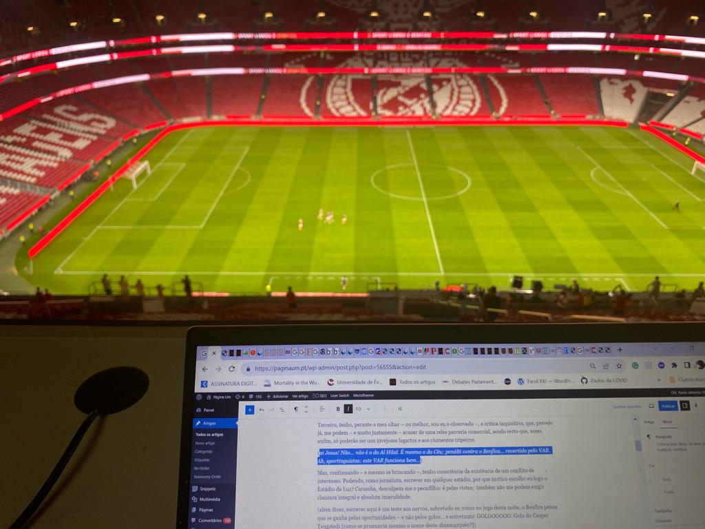 Mas, continuando – e mesmo se brincando –, tenho consciência da existência de um conflito de interesses. Podendo, como jornalista, escrever em qualquer estádio, por que motivo escolho eu logo o Estádio da Luz? Caramba, desculpem-me o pecadilho: é pelas vistas; também não me podem exigir clausura integral e absoluta imaculidade.