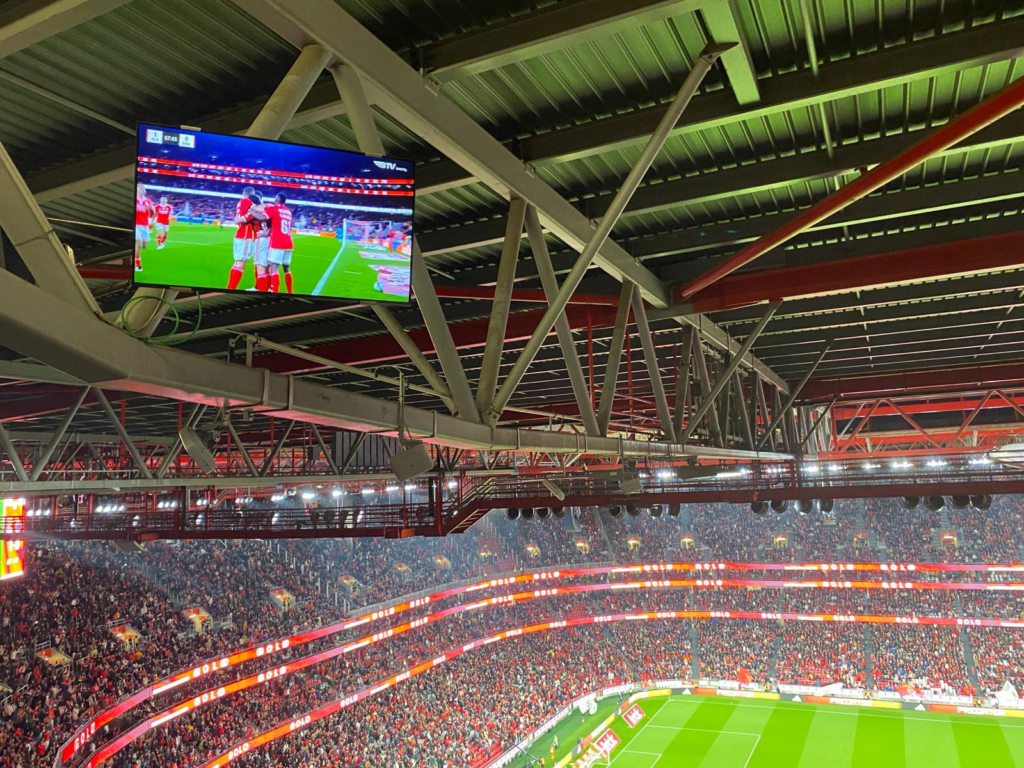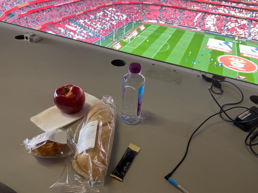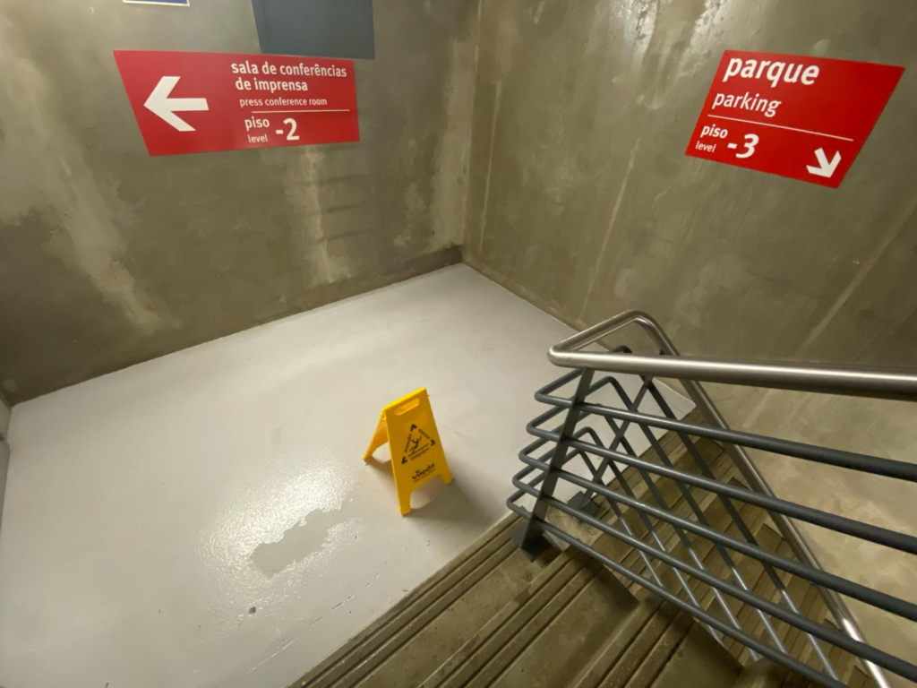 Isto está tão fraco que, na verdade, acho que houve um sinal, sim, mas aziago, que é a poça de água ao fim das escadas de acesso aos elevadores da comunicação social aqui do estádio. E eu até fotografei o aviso de piso escorregadio…