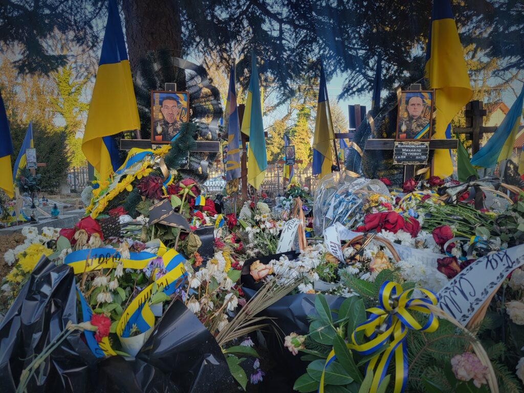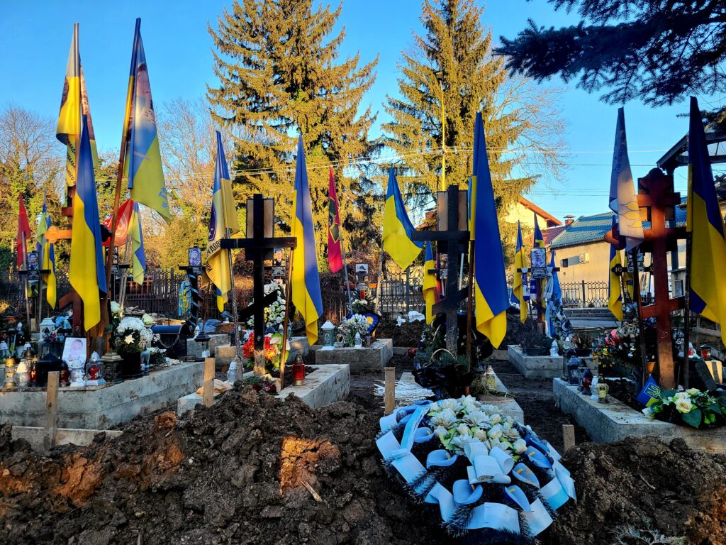 Debaixo de um tímido sol de inverno, dois jovens cavavam buracos pouco profundos no meio de um tumulto de bandeiras ucranianas e coroas comemorativas. Os caixões de madeira já estavam preparados. Três ou quatro soldados são enterrados aqui todas as semanas – aqui e em todo o país, em todas as aldeias ucranianas.