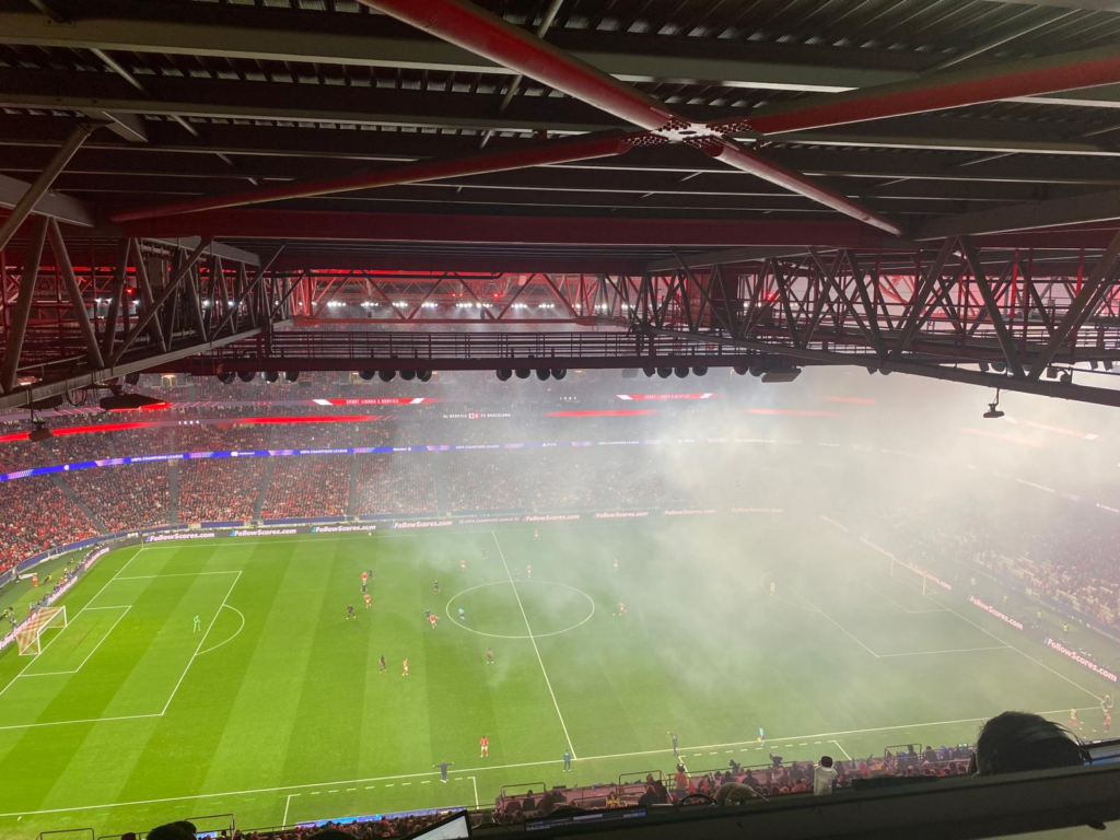 (para estragar a festa, e o Benfica apanhar uma valente e justificada multa da UEFA, os tontos dos No Name Boys, ou quem sejam eles, lançam tochas e outros artefactos; nunca compreendo a razão de as direcções dos clubes permitirem estas diatribes)
