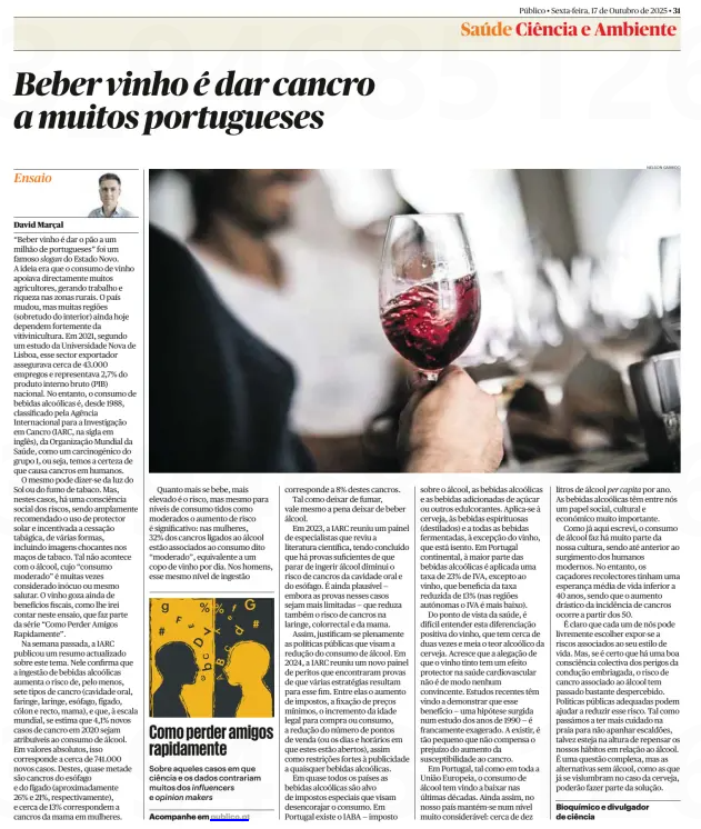 Em última análise, o que deve ser combatido não é o vinho, mas o discurso alarmista e sensacionalista do David Marçal, que reduz a complexidade da evidência científica a slogans de indignação. Beber vinho não é dar cancro — é, quando sensatamente praticado, uma expressão de cultura, de convivência e de equilíbrio. É isso que a ciência, quando é fiel a si própria, continua a demonstrar. E a vida.