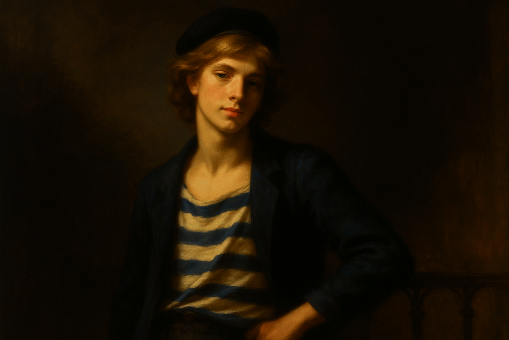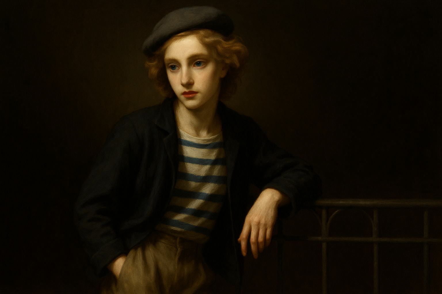 Boina francesa, cinzento-escura. Um casaco curto, azul-marinho, aberto sobre a blusa de riscas largas, azuis e brancas. Calças soltas. O corpo ligeiramente inclinado, apoia-se sobre a frágil grade que delimita o terminal rodoviário.