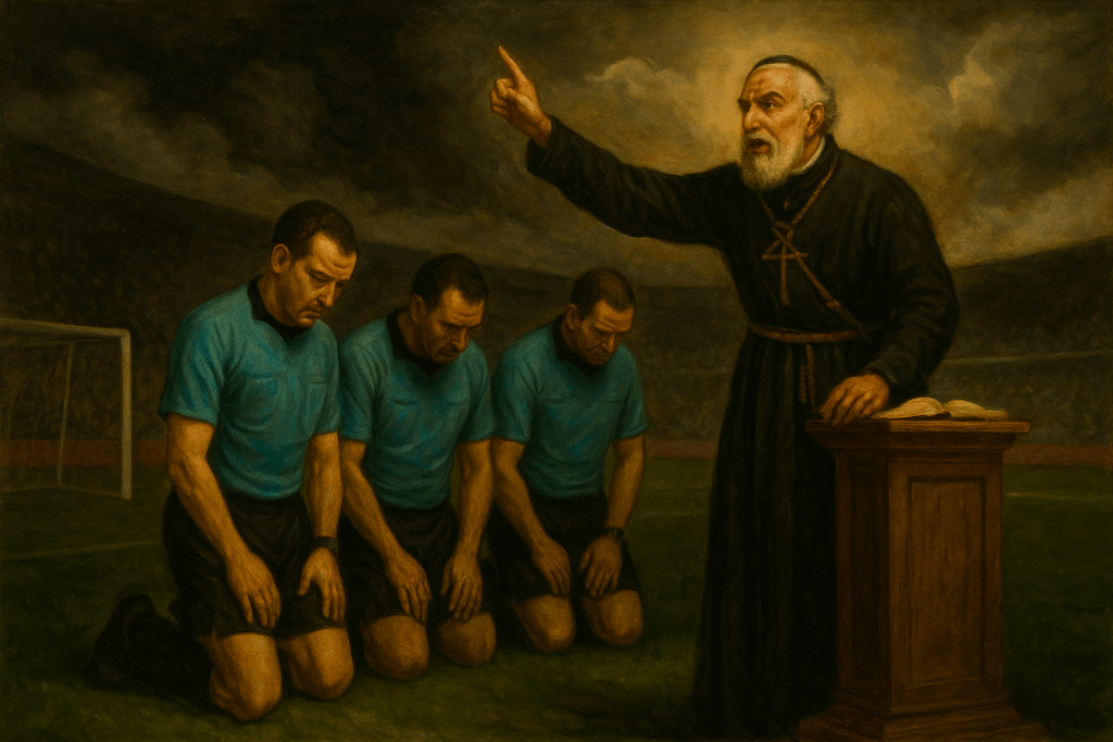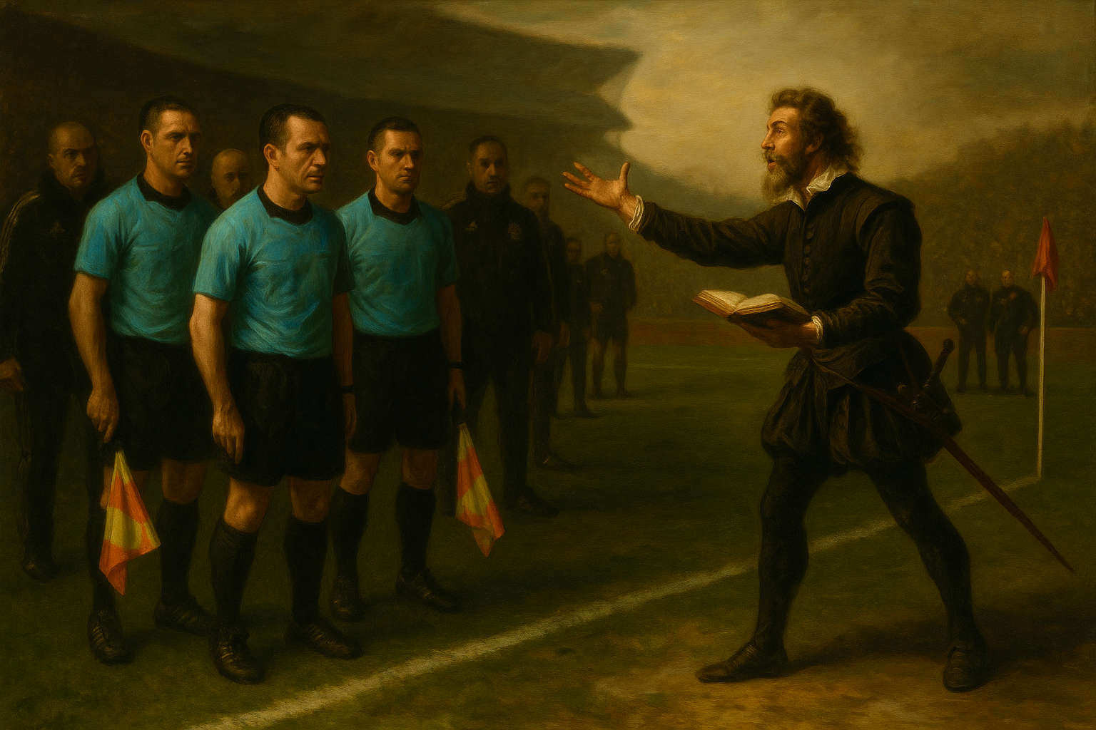 “Senhor, a vossa consciência deve ser mais leve que o vosso sopro, e os erros que cometestes pesam mais do que o próprio jogo. Se apitais sem fé, é porque a perdestes; e quem perde a fé perde também o ouvido da razão. Digo-vos: sois pior que Pilatos, pois no apito final lavais as mãos em suor alheio.”