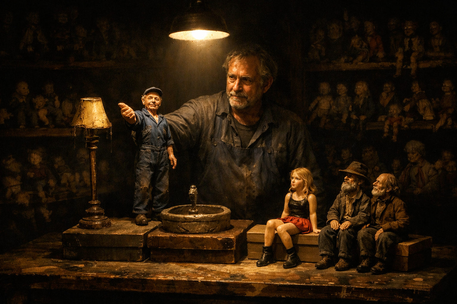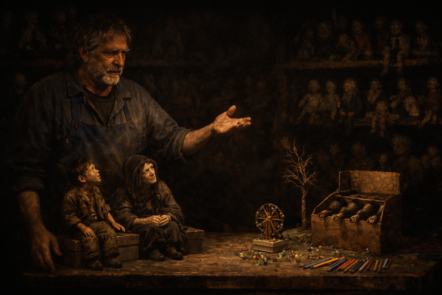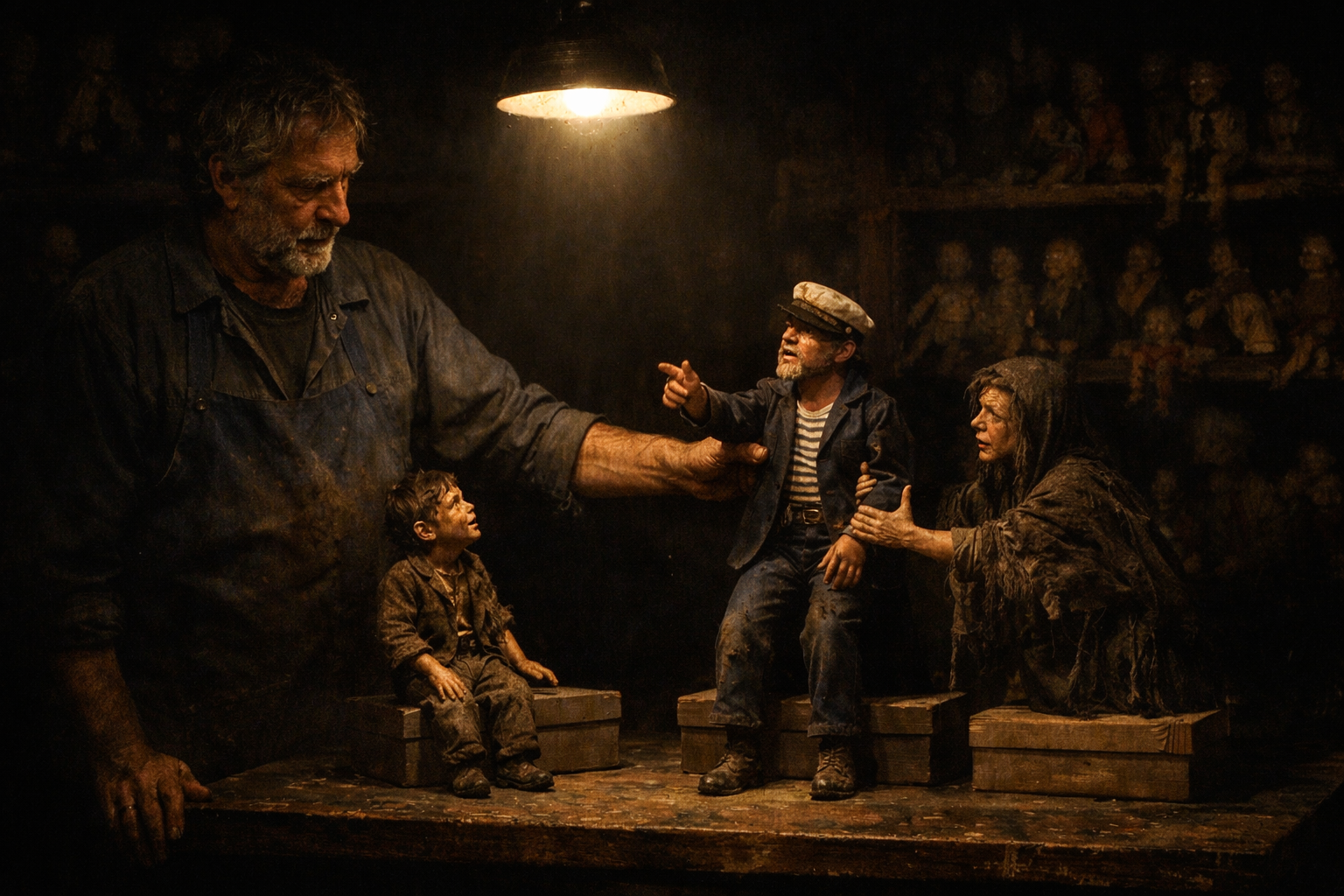 Um minuto de silêncio e imobilidade basta para que eu me concentre. Abro os olhos e estendo o braço para o maior dos bonecos. O Artesão é um homem grisalho que veste um macacão de brim azul. Levo-o à boca da cena para que cumprimente o público. Quando os aplausos cessam, com o polegar levantado, ele aponta para trás (o fundo do palco, onde estão os bonecos) e fala.