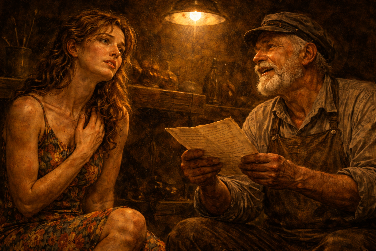 A Prostituta agarra a mão do Artesão e, sorrindo ironicamente, fala.