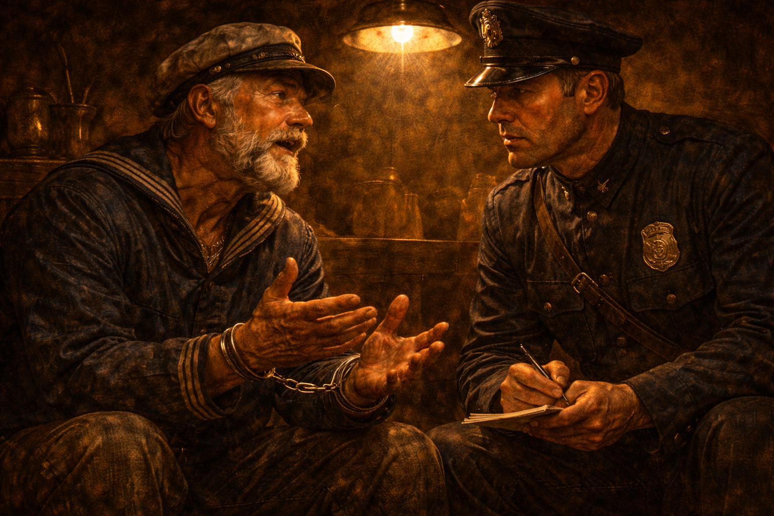 O Marinheiro se levanta bruscamente e, mais uma vez indicando o Artesão, se pronuncia.