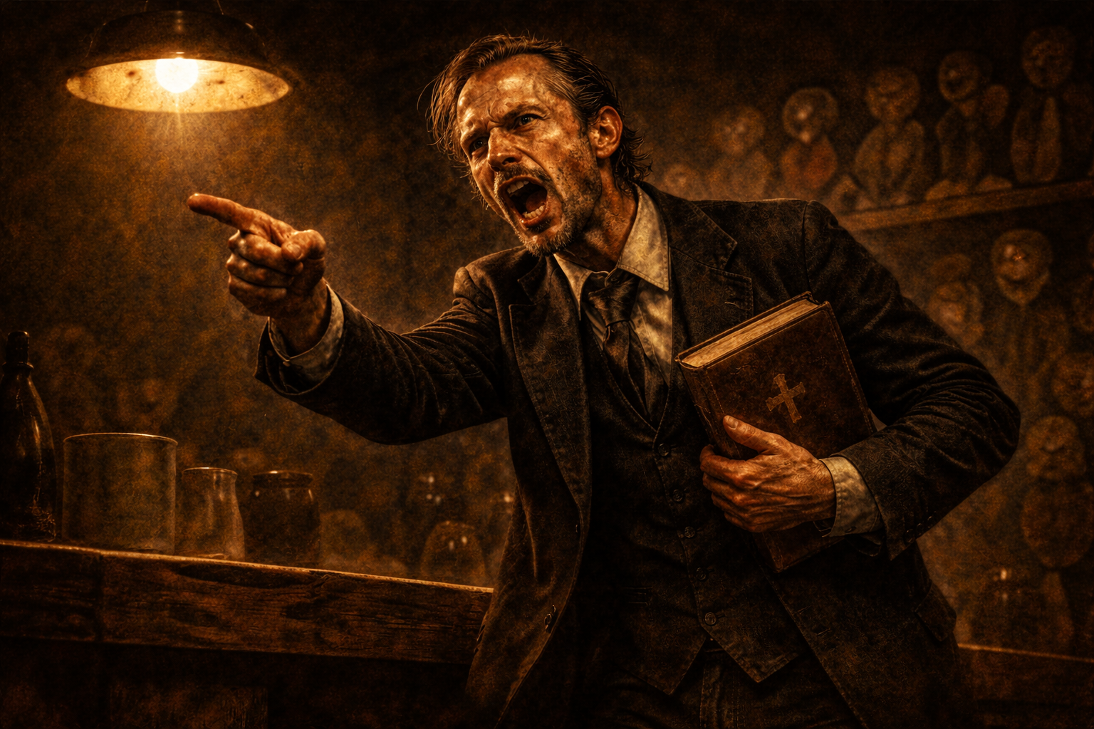 Coloco em cena o Pregador, homenzinho mirrado, espremido em terno preto, cabelo enlameado em brilhantina e Bíblia na mão.