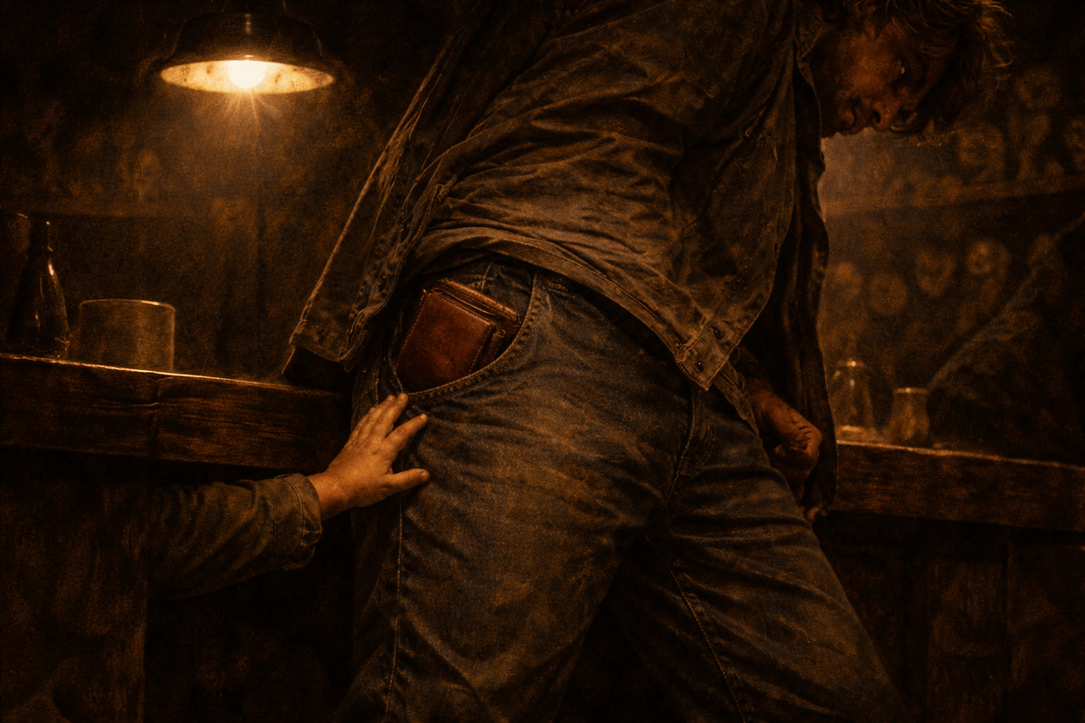 Num gesto muito rápido, o Pivete rouba a carteira do bolso da calça do Drogado e, correndo, sai de cena.