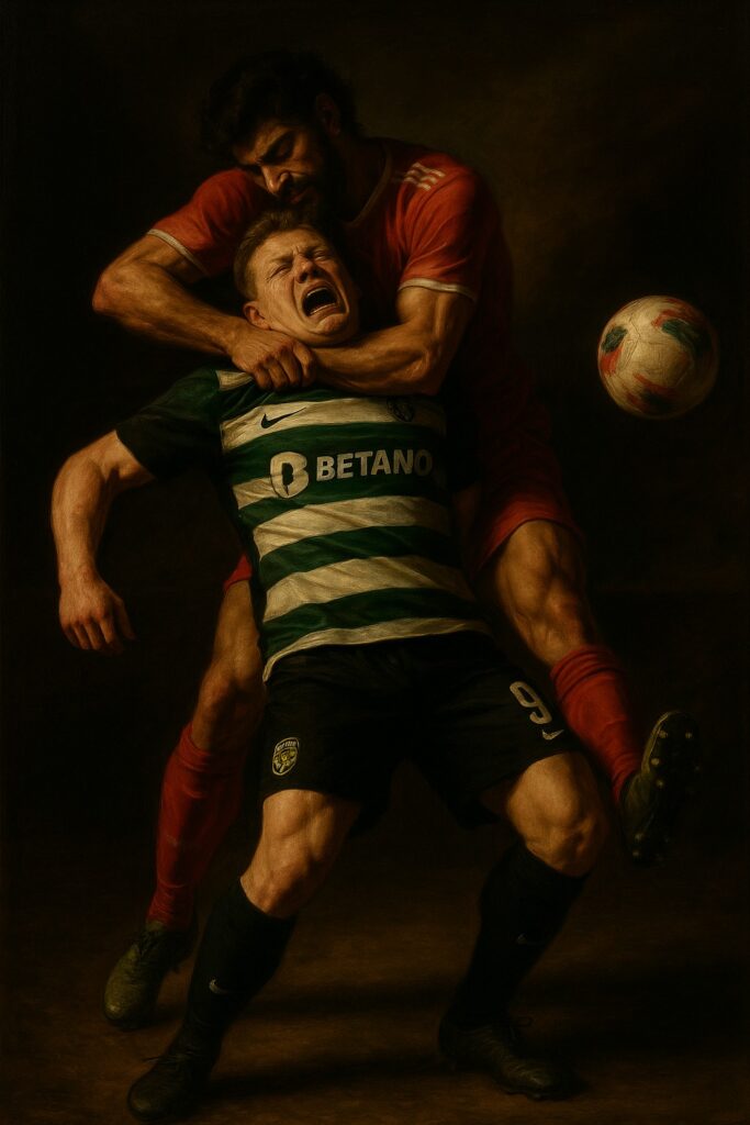 Retrato ao estilo de Caravaggio (‘pintado’ pelo ChatGPT) alusiva à (suposta) falta de um jogador do Benfica contra o Gyökeres, belíssimamente fotografada por Tiago Petinga para a Lusa.