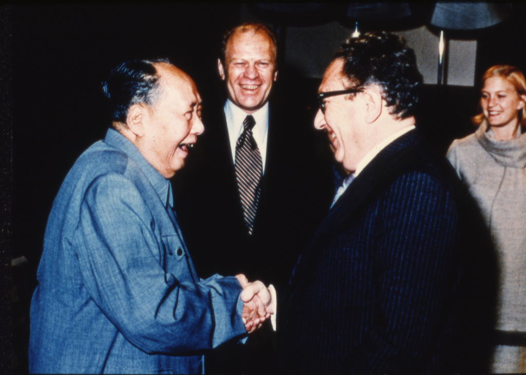 Henry Kissinger cumprimentando Mao Tse Tung em finais de 1975, sob o olhar do Presidente norte-americano Gerald R. Ford e sua filha Susan Ford