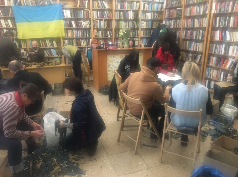 Biblioteca em Lviv, onde se lê, canta e se costuram camuflados para tanques ucranianos.