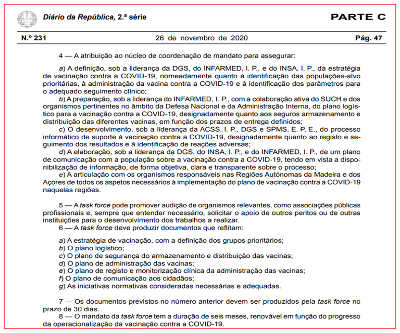 Toda a discussão sobre o processo de vacinação tem um marco inicial incontornável: o Despacho n.º 11737/2020, de 26 de Novembro de 2020, que criou a task force para a elaboração do Plano de Vacinação contra a covid-19.
