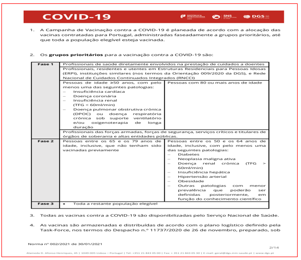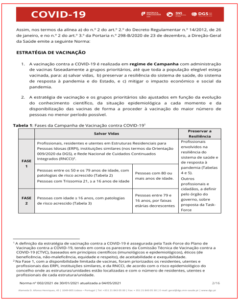 A norma 002/2021, publicada a 30 de Janeiro de 2021, definia a Fase 1 da vacinação, com foco exclusivo em: