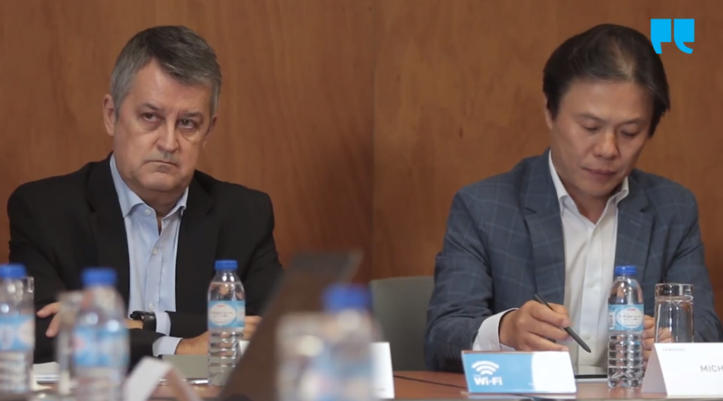 Vasco Teixeira, presidente do administração da Porto Editora, e Michael You, director-geral da Samsung Portugal, em 2017 durante a assinatura de um protocolo para o desenvolvimento de manuais escolares. Alguns anos depois, à boleia da venda de licenças anuais para uso dos manuais, a Porto Editora vende tablets do seu parceiro.