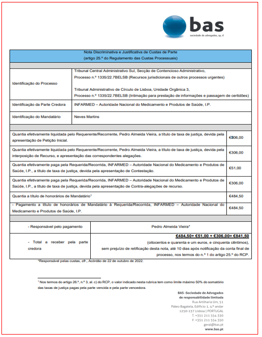 Documento para pagamento das custas judiciais exigidas, como habitualmente, pela outra parte; neste caso, pelo Infarmed. Sobre o facto de o PÁGINA UM ter identificado em concreto o interesse em consultar toda a documentação que identificasse o “corpo estranho” presente num lote de vacinas contra a covid-19 da Moderna, o acórdão do Tribunal dá uma interpretação simultaneamente curiosa e preocupante: “(…) atento o princípio da proporcionalidade sempre haveria que na ponderação de interesses [divulgar ou esconder] salvaguardar informação científica e farmacêutica da qual inexiste a devida certeza de molde a evitar especulações ou receios infundados na população”.