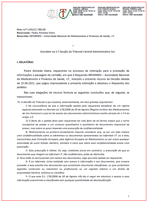 Em causa, neste processo, estava o pedido do PÁGINA UM PARA acesso “de todo e qualquer documento administrativo na posse do INFARMED que tenha sido transmitido por carta normal (em papel); por mensagem de correio electrónico, por outro qualquer sistema digital sonoro ou audiovisual pela Agência Europeia do Medicamento (EMA) e outras entidades internacionais homólogas do INFARMED, desde 2020 até à presente data.”
