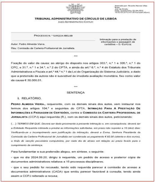 O Tribunal Administrativo de Lisboa deu provimento a uma intimação interposta pelo PÁGINA UM, condenando a Comissão da Carteira Profissional de Jornalista (CCPJ) a facultar as actas de reuniões do Plenário e do Secretariado, bem como elementos relativos a quinze processos disciplinares extintos por força da aplicação da Lei da Amnistia de 2023. A sentença, proferida na passada semana pelo juiz Ricardo Vilas Boas, salienta que os fundamentos invocados pela CCPJ para recusar o acesso careciam de qualquer base legal, considerando que o direito à informação administrativa por parte de um jornalista deveria prevalecer.