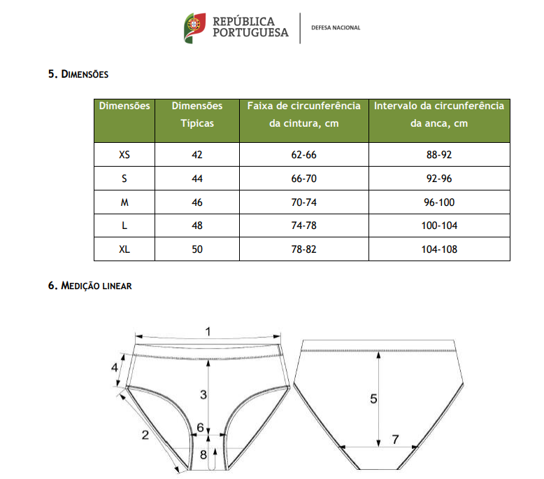 Segundo as cláusulas técnicas do contrato, as cuecas devem ser compostas por “uma parte da frente, uma parte de trás e um reforço com um forro” e vão ser cosidas em ponto de linha dupla de quatro fios. Além disso, a parte da cintura deve ter uma fita jacquard elástica e as cuecas devem ter as cores “coiote, verde azeitona e preto” que fazem o padrão camuflado do exército.