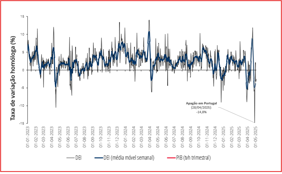 Indicador diário de actividade económica. / Fonte: Banco de Portugal A reposição de electricidade demorou longas horas, mais do que sucedeu em Espanha, provando que a REN-Redes Energéticas e a EDP foram apanhadas desprevenidas. Aliás, para activar a barragem de Castelo de Bode, a EDP teve de levar um gerador que não se encontrava no local, segundo noticiou o jornal Expresso.