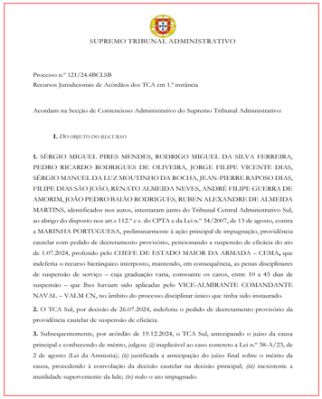 Primeira página do acórdão do Supremo Tribunal Administrativo. Estas sanções seriam depois confirmadas pelo próprio Gouveia e Melo num despacho que indeferiu o recurso hierárquico interposto pelos advogados dos militares. Esse despacho do então Chefe do Estado-Maior da Armada foi agora arrasado pelos juízes-conselheiros do Supremo Tribunal Administrativo.
