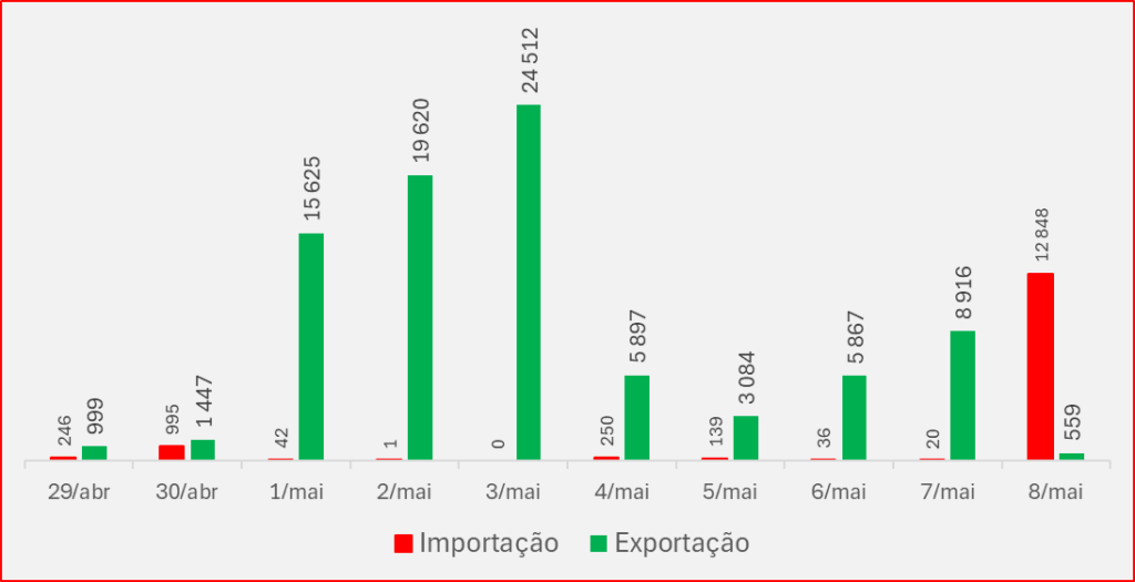 Nos dias seguintes ao apagão, a REN informou que as trocas comerciais com Espanha estavam suspensas, sendo apenas admitidas em situações técnicas excepcionais. Contudo, os dados mostram que Portugal continuou a exportar para Espanha durante quase todo o período entre 29 de Abril e 7 de Maio. E o fornecimento não foi pequeno: num total de 85.965,5 MWh exportados neste período de nove dias, os valores diários oscilaram entre 999,3 MWh, logo a 29 de Abril, e 1.447 MWh no dia seguinte. Nos primeiros três dias de Maio, as exportações totalizaram 59.756 MWh, descendo para 23.764 MWh entre os dias 4 e 7 de Maio. Já hoje, Portugal teve apenas um pequeno período de exportação durante a madrugada, num total de 559 MWh. No mesmo intervalo entre 29 de Abril e 7 de Maio, Portugal apenas importou 1.729 MWh — um valor residual, justificado apenas por necessidades técnicas.