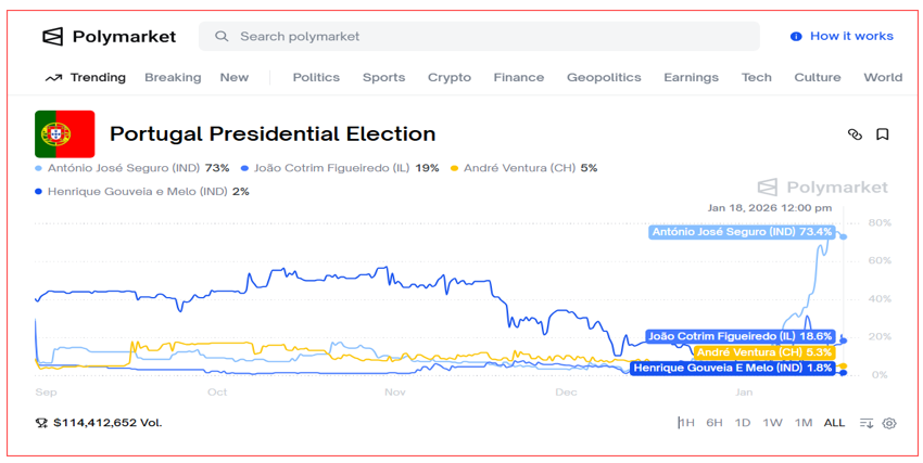As eleições presidenciais portuguesas entraram, de forma inesperada, no radar da especulação política global. No Polymarket, uma das maiores plataformas internacionais de mercados de previsão envolvendo apostas, o mercado dedicado à eleição do próximo Presidente da República em Portugal acumulou já um volume de 114,4 milhões de dólares, posicionando-se como o sexto maior mercado político do mundo em termos de capital movimentado.