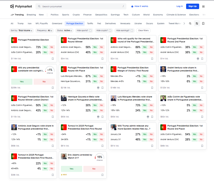No início deste domingo, as eleições em Portugal estavam posicionadas na 10.ª posição em termos de volume total de apostas no Polymarket, sendo o mercado político mais procurado pelos especuladores fora dos Estados Unidos. Com efeito, para as eleições deste domingo, o volume de apostas é mais modesto, embora haja vários mercados. Por exemplo, para o vencedor de hoje há um volume de apostas de cerca de 2,6 milhões de dólares. Para quem se qualifica para a segunda volta já se mobilizaram 1,8 milhões de dólares. Mas também há uma aposta para quem fica em terceiro lugar que mobilizou apenas 47 mil dólares. No total existem 18 diferentes tipos de apostas para as eleições presidenciais, que incluem adivinhar o intervalo de percentagem dos principais candidatos.