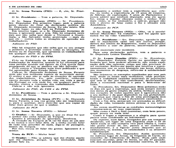 A primeira é mais mundana. O vosso Miguel teve um pai que, apesar de douto e eloquente, não enjeitava uns bons insultos ad hominem, lembrando os meus tempos em que certos fidalgos de paletó se batiam às bengaladas à porta do Grémio somente por vírgulas mal colocadas. Recordo-me, por exemplo, de um plenário de Janeiro de 1982 — verdadeira ópera bufa parlamentar — em que o “Sr. Sousa Tavares”, então deputado do PSD, se ergueu, inflamado, e bradou ao comunista Jerónimo de Sousa um sonoro “Olhe, vá à merda!”, seguido, na mesma golfada, de um “idiota!”, e logo depois de um “mandrião!”. E, não satisfeito, arrematou com um “Vá trabalhar, que foi aquilo que nunca fez na vida!”, coroando a tirada com um derradeiro “calaceiro!”, dito com o fervor de um padre em púlpito e a pontaria de um esgrimista. E quase me esquecia que, na arenga, lhe chamara antes “idiota!”.