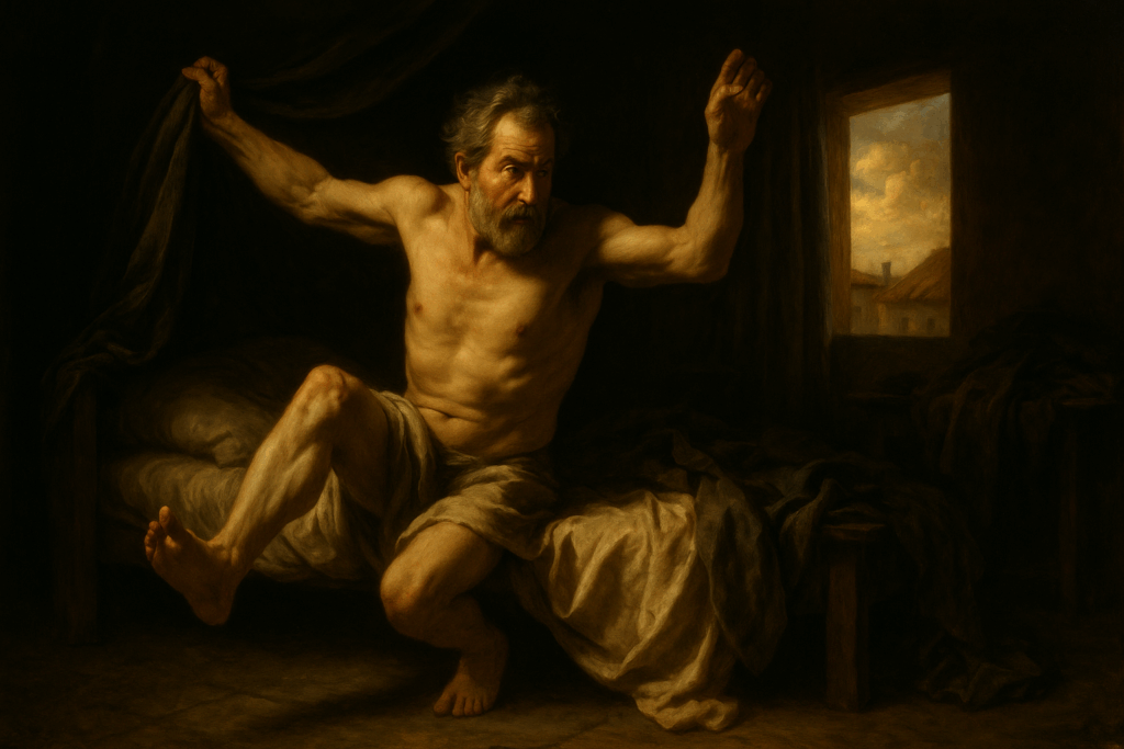 Ressabiado, pressentindo maus bocados, ele se sentou devagar e cuidadosamente.
