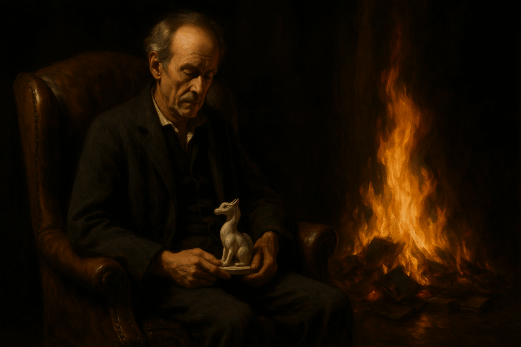 Pegou o dragão de porcelana e com ele no colo sentou-se na poltrona.