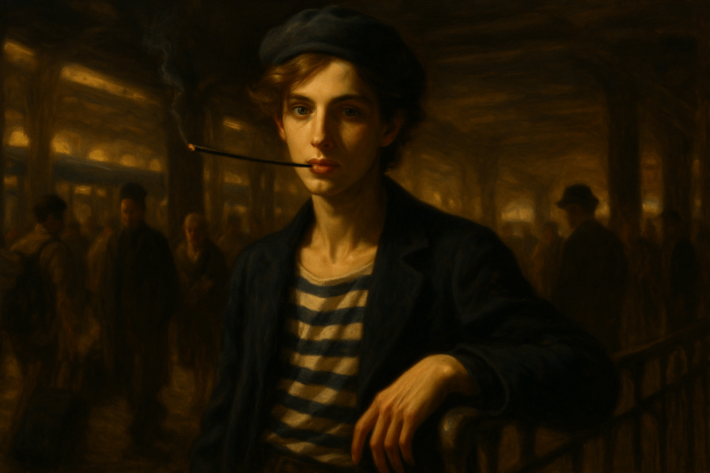 Boina francesa, cinzento-escura. Um casaco curto, azul-marinho, aberto sobre a blusa de riscas largas, azuis e brancas. Calças soltas. O corpo ligeiramente inclinado, apoia-se sobre a frágil grade que delimita o terminal rodoviário.