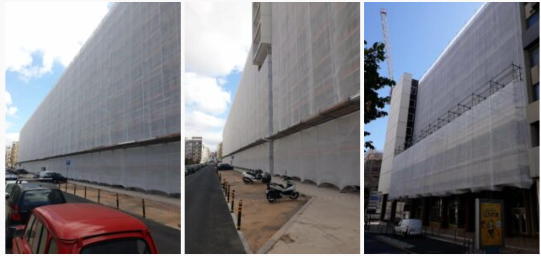 Fotos divulgadas pela Tubos Vouga, em Junho de 2021, quando concluiu a instalação dos andaimes na fachada voltada para a Rua Febo Moniz (as duas fotos da esquerda) e dos andaimes suspensos na fachada virada para a Av. Almirante Reis (foto da direita). / Foto: D.R.