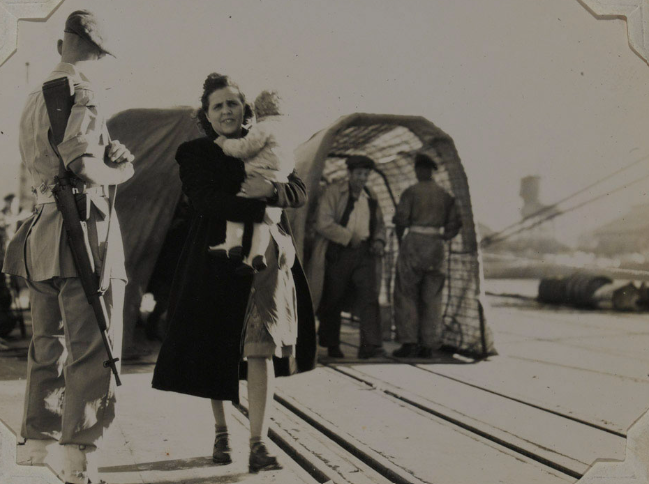 Mulher judia e o filho chegam ao porto de Haifa, Palestina, 1947 — um dos muitos desembarques de refugiados após a Segunda Guerra Mundial, sob o bloqueio britânico à imigração judaica. Foto: National Army Museum (Londres).
