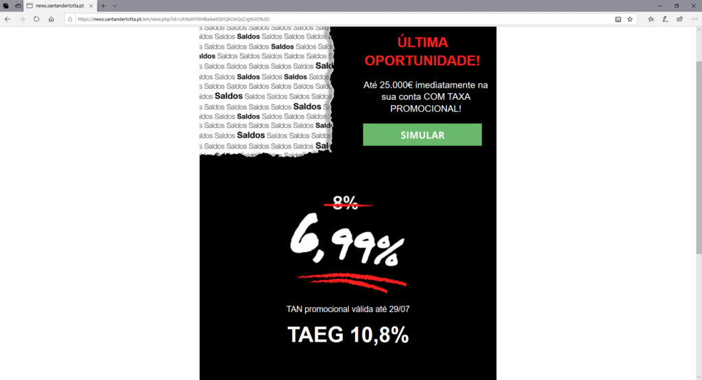 Além disso, conferia detalhes sobre simulação para um empréstimo de 7.500 euros, ressaltando que “o crédito ao consumo tem crescido de forma muito expressiva em Portugal e [que] os ‘saldos’ do Santander são um exemplo da aposta que os bancos fazem, na contratação de empréstimos online”. Na peça, não se fazia referência a nenhuma outra campanha de qualquer outro banco.