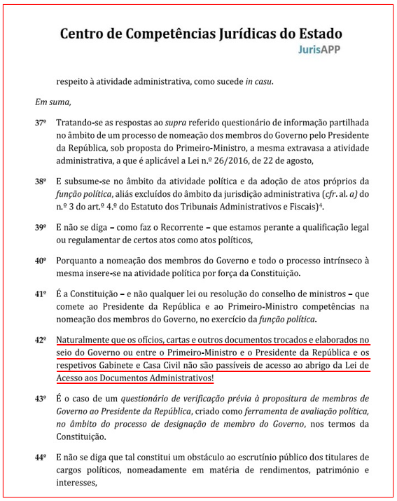 O Centro de Competências Jurídicas do Estado – um “gabinete jurídico de luxo” da Presidência do Conselho de Ministros – considera que “os ofícios, cartas e outros documentos trocados e elaborados no seio do Governo ou entre o Primeiro-Ministro e o Presidente da República e os respetivos Gabinete e Casa Civil não são passíveis de acesso ao abrigo da Lei de Acesso aos Documentos Administrativos”.