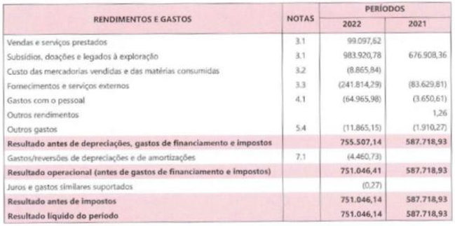 O dinheiro transferido para os bolseiros ou para as instituições de ensino estará, afinal, integrada no fluxo de pagamento a fornecedores (que, em 2022, atingiram 284.229 euros), não constituindo um pagamento ao pessoal (56.5454 euros, nesse ano). O valor que surge nas actividades operacionais como “Recebimentos de clientes e utentes” (que está com valor negativo), num total de 99.098 euros, será relativo às vendas de merchandising.