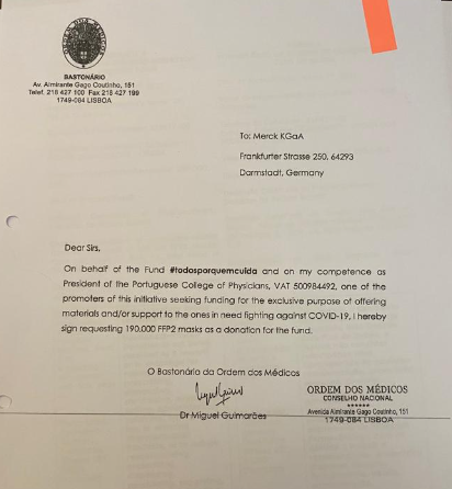 Com efeito, no mesmíssimo dia em que, a Norte, em Vila Nova de Gaia, o município comprava máscaras FFP2 a 0,276 euros – pagando assim 138.300 euros por 500.000 máscaras –, a Sul, na lisboeta Avenida Gago Coutinho, o bastonário Miguel Guimarães apunha a sua assinatura num contrato para selar um donativo da farmacêutica alemã, de modo a receber de “borla” 190.000 unidades do mesmo equipamento para a campanha “Todos por Quem Cuida”.