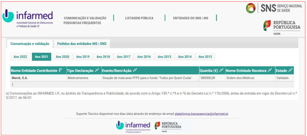 Ora, consultando o Portal do Infarmed não consta qualquer referência aos 20 donativos da Apifarma entre 14 de Abril de 2020 e 6 de Abril de 2021 – num total de 1.251.251 euros – nem aos donativos da Apormed (5.000 euros), Bene Farmacêutica (20.000 euros), Bial Portela (20.000 euros), Ipsen Portugal (12.000 euros) e Laboratórios Atral (10.000 euros). A representante legal dos três titulares da conta solidária – saliente-se que o PÁGINA UM remeteu questões específicas a cada um deles, que optaram por não responder individualmente – diz que “não compete às entidades que promoveram a ação solidária declarar os donativos no Portal da Transparência e Publicidade, mas às entidades que (…) fizeram os donativos”, acrescentando que “a Ordem dos Médicos validou todos os donativos que foram declarados no Portal da Transparência e em que foi identificada.”