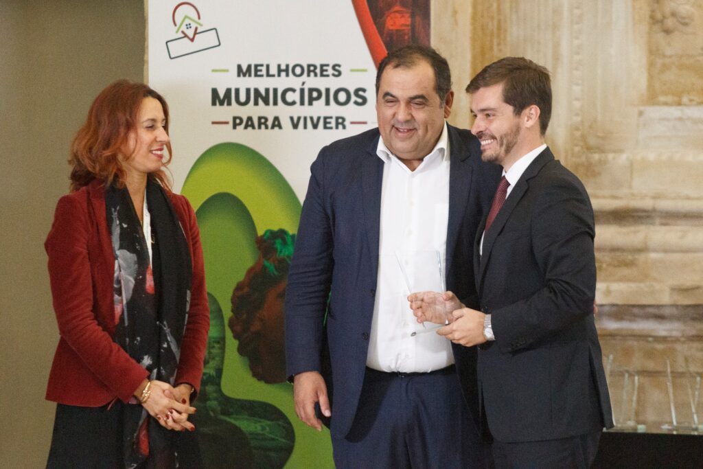 Rui Lages (à direita), presidente da Câmara de Caminha, a receber em Coimbra, no dia 3 de Novembro, um dos galardões, em frente de Patrícia Jardim da Palma, presidente do INTEC. Os dois assinaram, nesse mesmo dia, um contrato no valor de 12.500 euros para pagar a candidatura ao prémio. Foto: página do FB do INTEC.