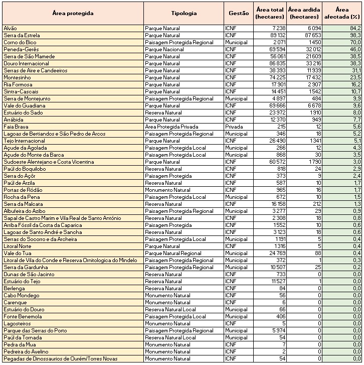 Além da Serra da Estrela e do Alvão, as áreas protegidas mais fustigadas são a Área de Paisagem Protegida do Corno do Bico (70% da área afectada), o Parque Nacional da Peneda-Gerês (46%), os Parques Naturais da Serra de São Mamede (39%), do Douro Internacional (38%), da Serra de Aire e Candeeiros (31%), do Montesinho (24%), da Ria Formosa (16%) e de Sintra-Cascais (11%).