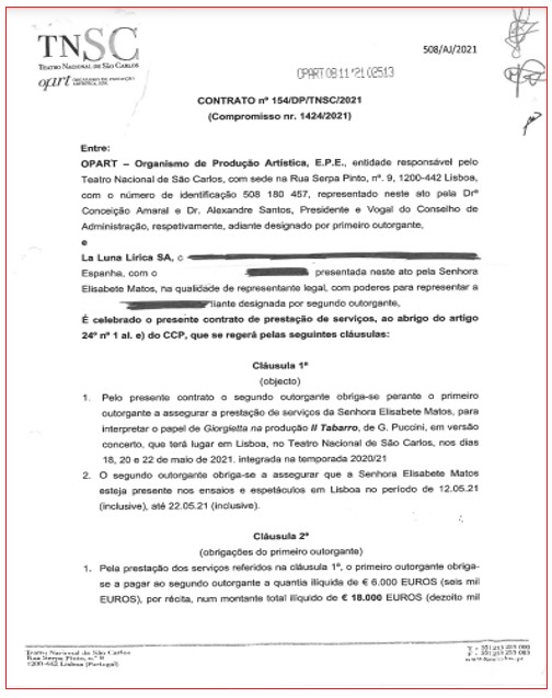 De facto, pela sua participação na ópera Il Tabarro, de Puccini, a soprano recebeu 18.000 euros por três récitas, mas entre o espectáculo e o conhecimento público do contrato mediaram oito longos meses. A ópera foi levada à cena entre 18 e 25 de Maio de 2021, mas o contrato entre a OPART e a empresa espanhola La Luna Lirica – da qual Elisabete Matos surge como representante – somente se assinou em 14 de Outubro do ano passado. No Portal Base, onde as entidades públicas inserem os contratos, apenas apareceu em 21 de Janeiro deste ano.