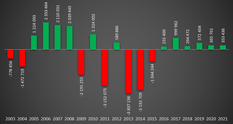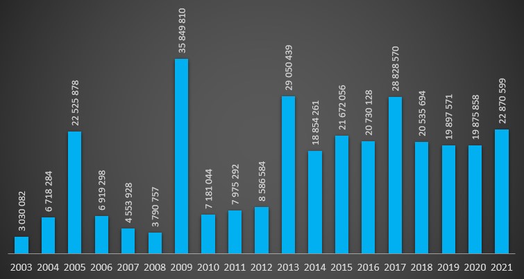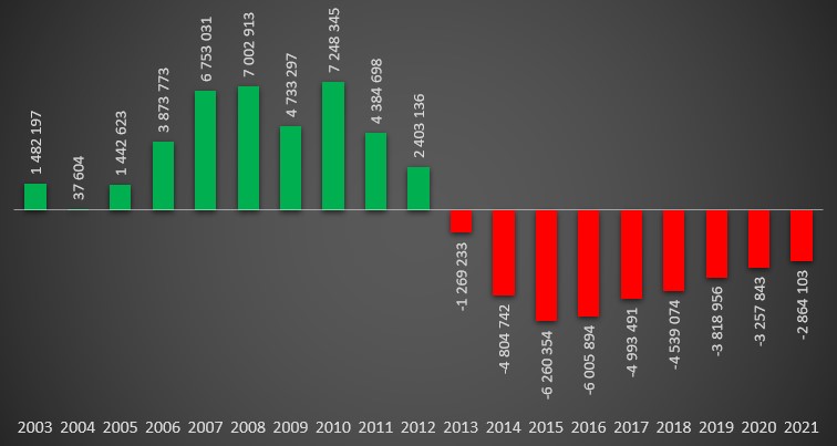 Com variações ao longo dos últimos nove anos, o seu passivo nunca baixou dos 18 milhões de euros, situando-se no final de 2021 em quase 22,9 milhões, quase mais 3 milhões do que em 2020.