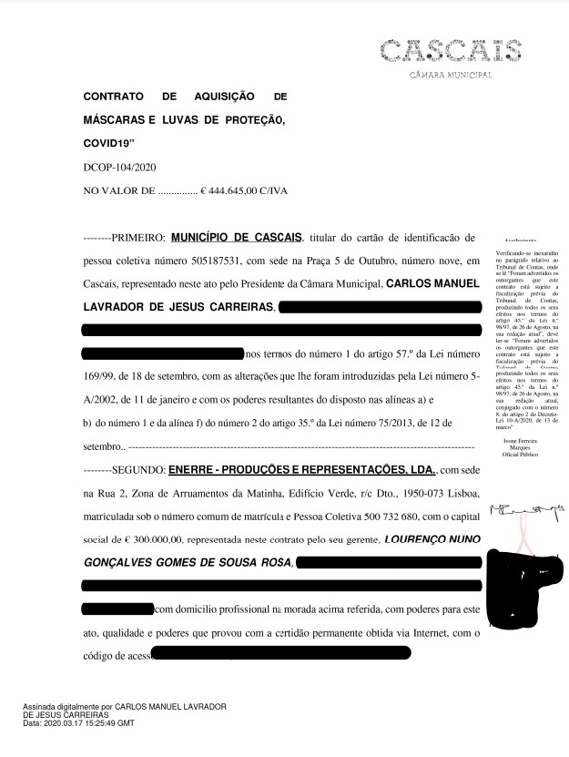 A Câmara Municipal de Cascais – que apenas tivera um contacto em 2019 com a ENERRE para a produção de brindes – terá pensado de forma diferente. Na segunda quinzena de Março do ano passado – poucos dias, portanto, após o post de marketing de Lourenço Rosa –, a autarquia liderada pelo social-democrata Carlos Carreiras nem tempo quase teve de pestanejar entre contratos com a ENERRE para aquisição de material de protecção, máscaras e termómetros no valor total de 2.200.400 euros.