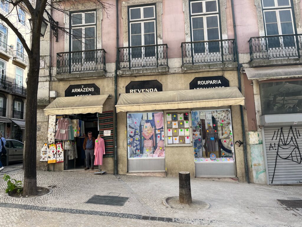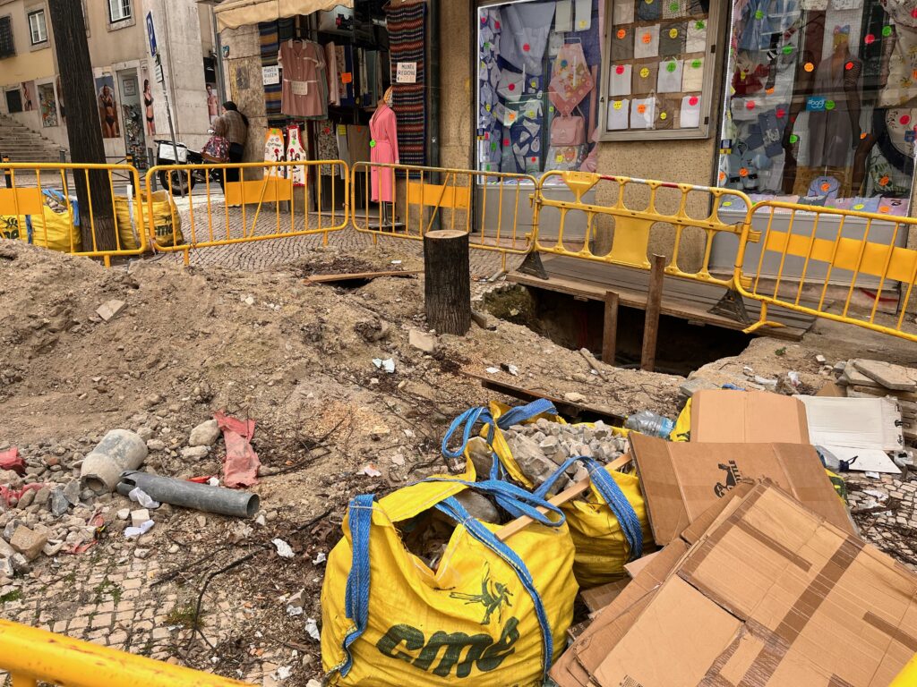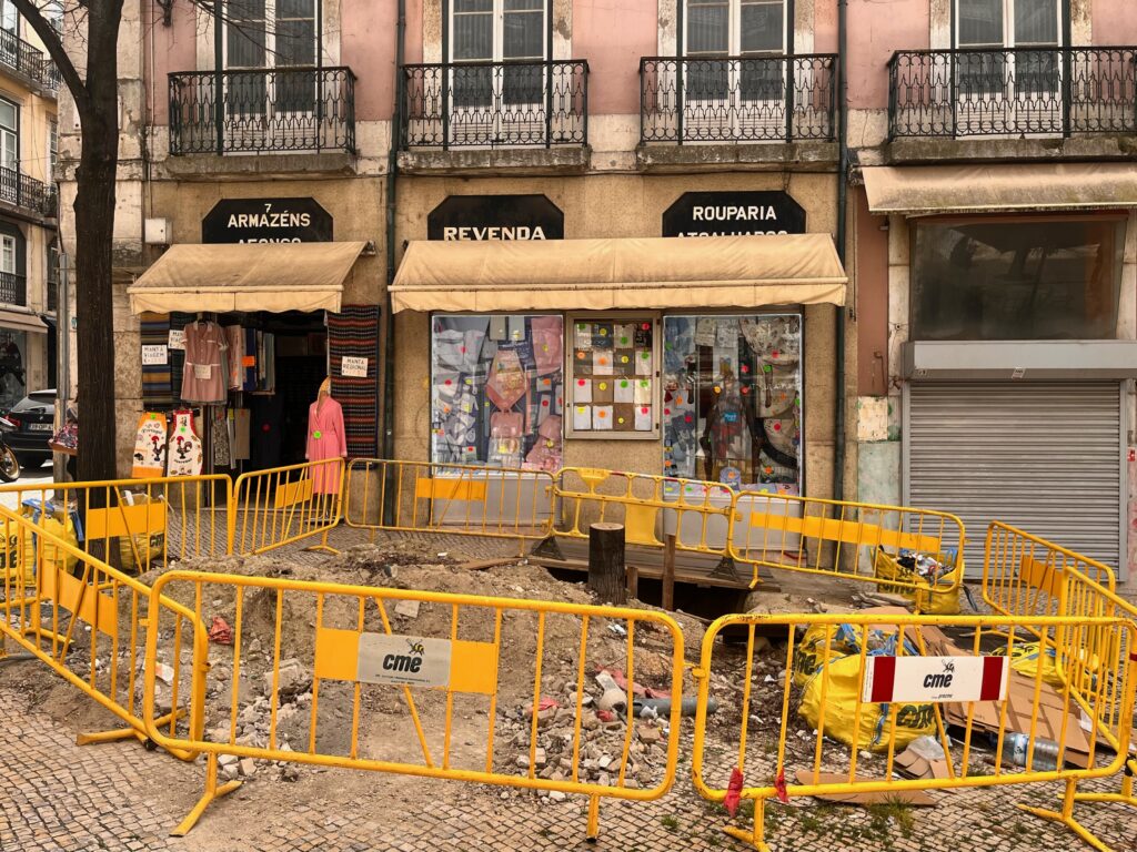 Fim de Março 2023, esquina da Rua dos Fanqueiros com a Rua de Santa Justa. Ao lado do estabelecimento “Armazéns Afonso”, de venda de roupa e tecidos, perto dos correios e limitado por barreiras de plástico, abre-se um considerável buraco no chão.