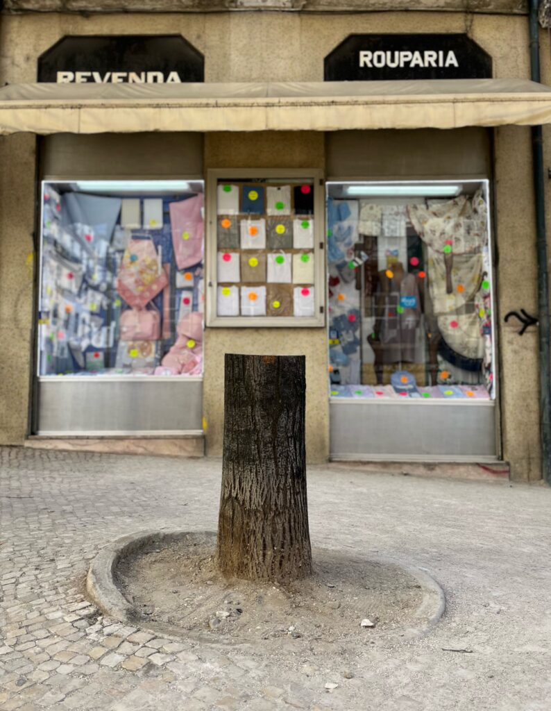 Dez dias se passaram, acrescidos aos cinco meses. Pelo sim, pelo não, Repórter LX passa no mesmo local para confirmar a situação e… nem de propósito, repara que, neste ínterim, o buraco foi tapado. Chão impecável, tudo limpinho, mas o coto da árvore, cortado, permanece no mesmo sítio, como se fosse um banco alto. Intrigado, pergunta ao mesmo comerciante como conseguiram, afinal, tirar os cabos sem a necessidade de remover as raízes da árvore.