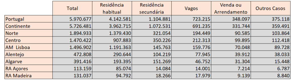 Número de alojamentos por segmento em Portugal e por regiões em 2021. Fonte: INE / Censos de 2021.
