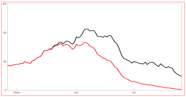 No entanto, nos últimos 10 dias de Junho, a média diária foi de 8,7 mil casos positivos. O decréscimo de casos positivos apresentou uma consistente tendência desde 19 de Maio, quando se registraram 27.481 casos, em média móvel de sete dias. Ao longo de Julho, a tendência decrescente manteve-se. No dia 10 desse mês, a média móvel de sete dias já estava abaixo dos 7.000 casos e no dia 31 estava em cerca de 3.000 casos.