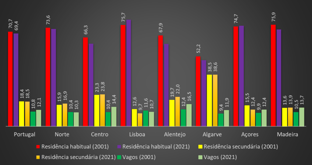 A região de Lisboa mostra ser aquela que registou uma evolução mais desequilibrada. Em 2001, agregava 27% do parque habitacional do país, mas apenas agregou 22% do crescimento global do país nas últimas duas décadas. Ou seja, o dinamismo na construção foi menor. O número de alojamentos vagos nesta região apenas aumentou em 10.449 alojamentos (que incluiu aqueles que estão devolutos, para venda, arrendamento ou demolição), e observa-se que o mercado imobiliário foi bastante dinâmico na habitação principal (mais 220.601 novos alojamentos), que foi mesmo “roubar” alojamentos secundários.