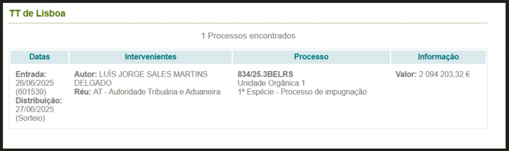 A esta acção judicial de Delgado soma-se a um processo de impugnação que o dono da TIN intentou junto do Tribunal Tributário contra a AT devido a uma dívida fiscal de 2.094.203,32 euros.