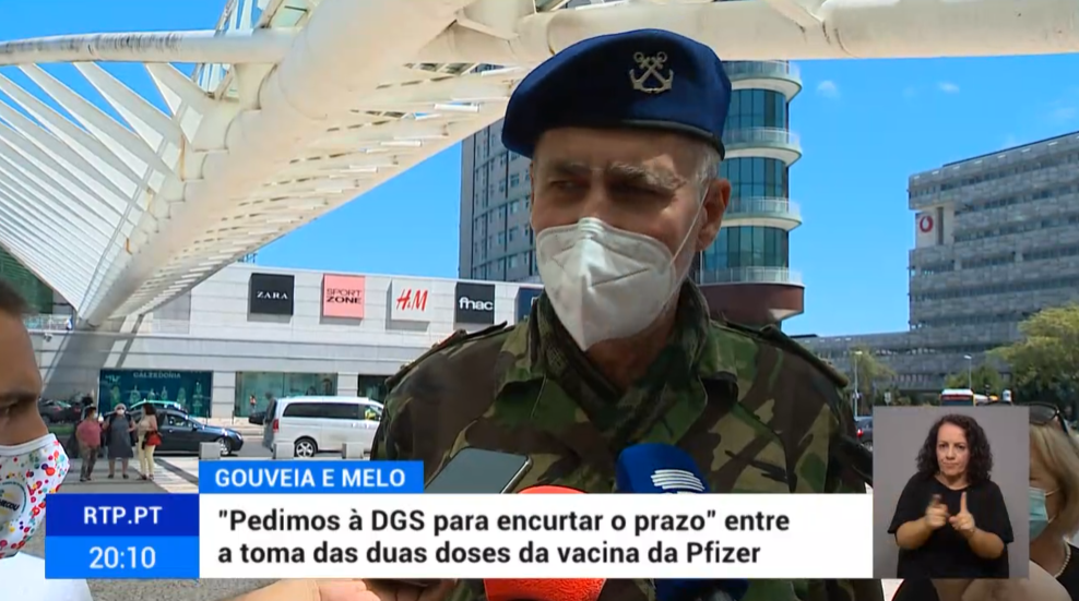 Gouveia e Melo, em Julho de 2021, foi um actor relevante deixado à solta e que ‘prendeu’ a prudência em relação à vacinação de jovens. Tiago Correia não está interessado em debater-se essa questão., porque também participou na narrativa. Fonte: captura de ecrã da RTP.
